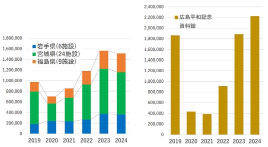 広島市の平和記念資料館(原爆資料館)の来訪数は、2024年にはコロナ禍前よりも増加し220万人に達している一方で、東北の伝承施設39施設(閉館含む)の来訪数は2023年から2024年に減少に転じており、広島市平和記念資料館1館の来館数より少ないのが現状でした。