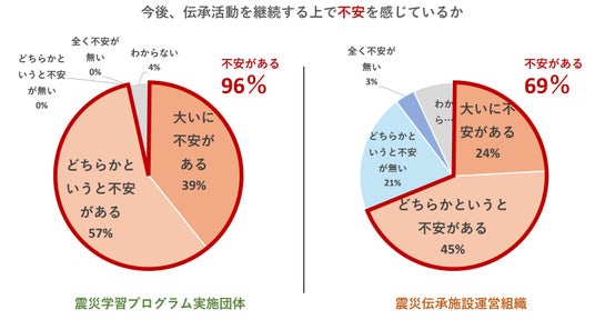 震災学習プログラム提供団体の96%、震災伝承施設の69%が今後の伝承活動の継続に不安を感じていました。