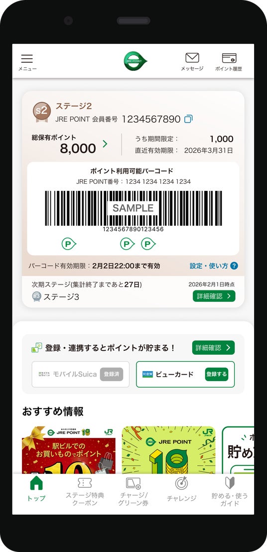 お客さまからのお声をもとに、JRE POINTアプリのトップ画面等をリニューアルします。JRE POINTアプリでログイン後、バーコードがトップ画面に表示されるようになり、スムーズにお買いものをお楽しみいただけます。その他にも、トップ画面から登録カード管理、サービス連携状況、ステージ特典クーポン、鉄道乗車回数やお買いものキャンペーンの達成状況を確認いただけるようになります。(2026年2月9日(月)リリース予定)