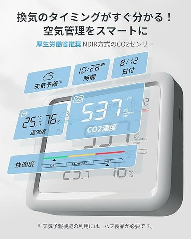 搭載されているのは、高精度で知られるNDIR(非分散型赤外線)センサー。CO2濃度を高い精度で測定でき、誤差の少ないモニタリングが可能です。また、温度と湿度もリアルタイムで表示するため、季節の変わり目や暖房使用時の乾燥対策にも役立ちます。