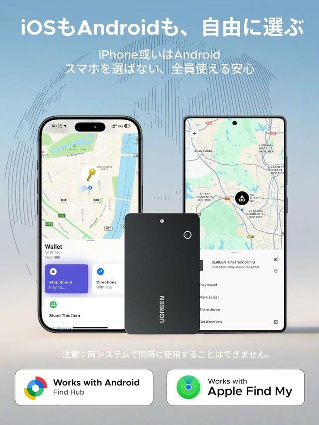 これはふたつ(Duo)のネットワーク=Appleの「探す」とGoogleの「Find Hub」に対応しており、iPhoneユーザーもAndroidユーザーも利用可能であることを指しています。
