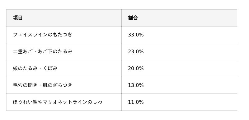 ボルニューマ施術前の主な悩みとして最も多かったのは「フェイスラインのもたつき」でした。