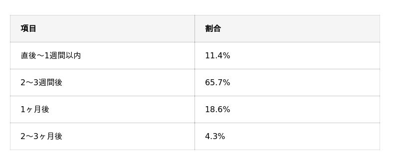 一方で、「直後~1週間以内」や「1ヶ月後」に効果を感じたという声もあり、効果を実感するタイミングには個人差が見られます。