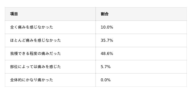 - 施術中の痛みについて、「我慢できる程度の痛みだった」と答えた人が最も多く、48.6%という結果に