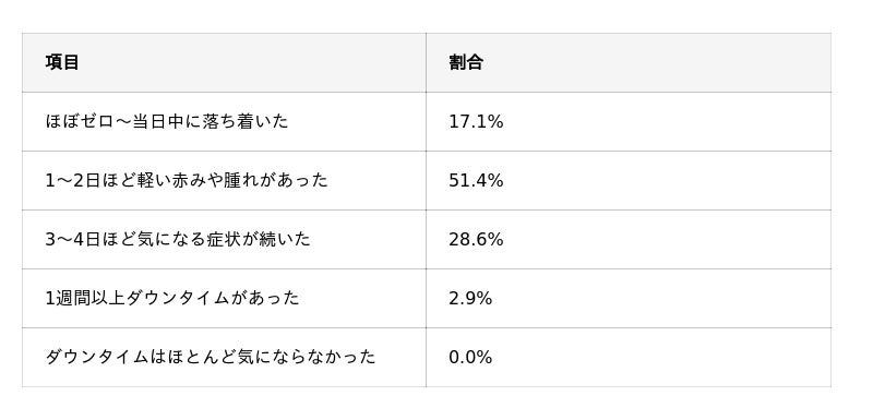 - ダウンタイムに関して「1~2日ほど軽い赤みや腫れがあった」と回答した人は全体の過半数(51.4%)を占めた