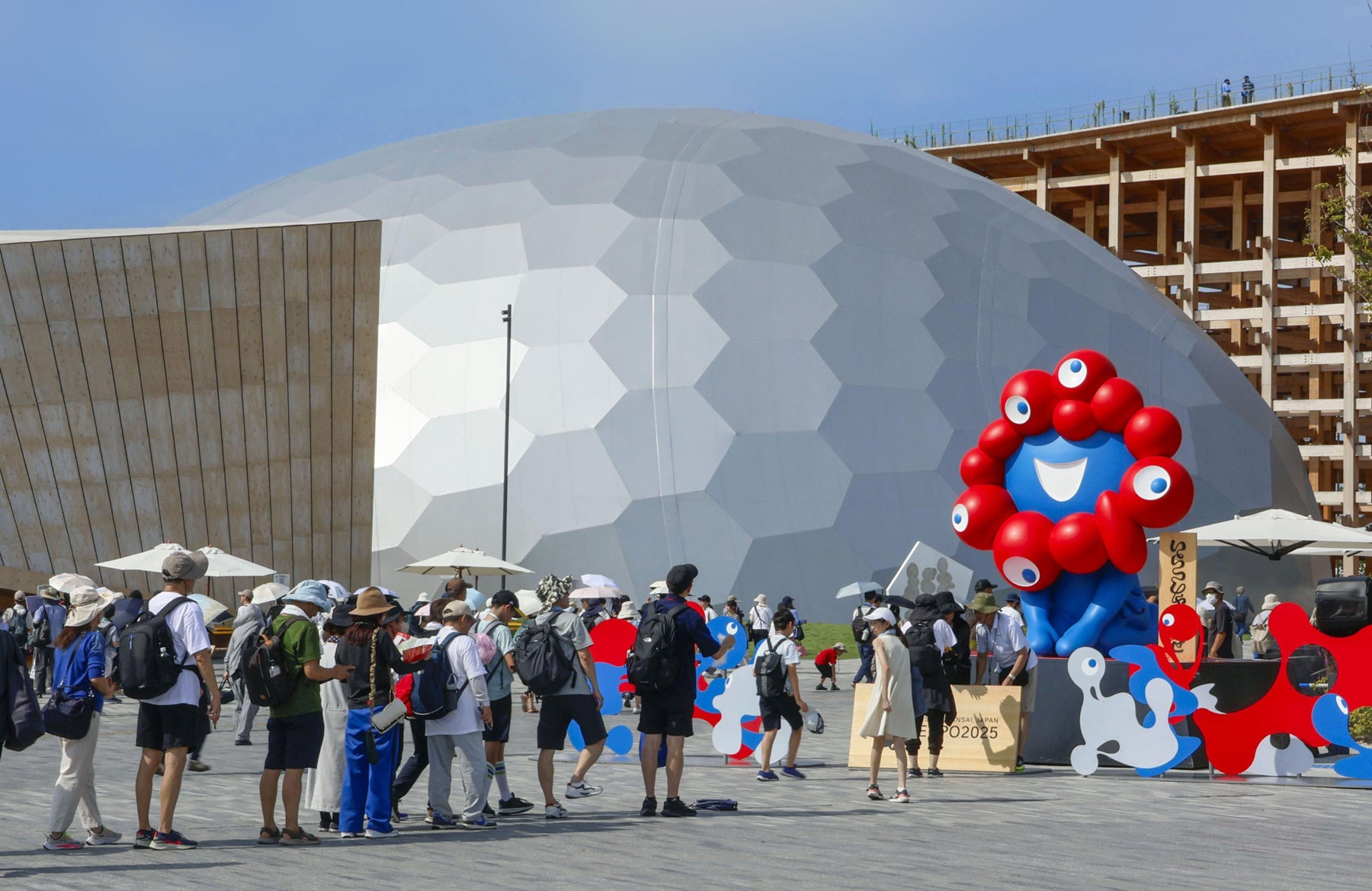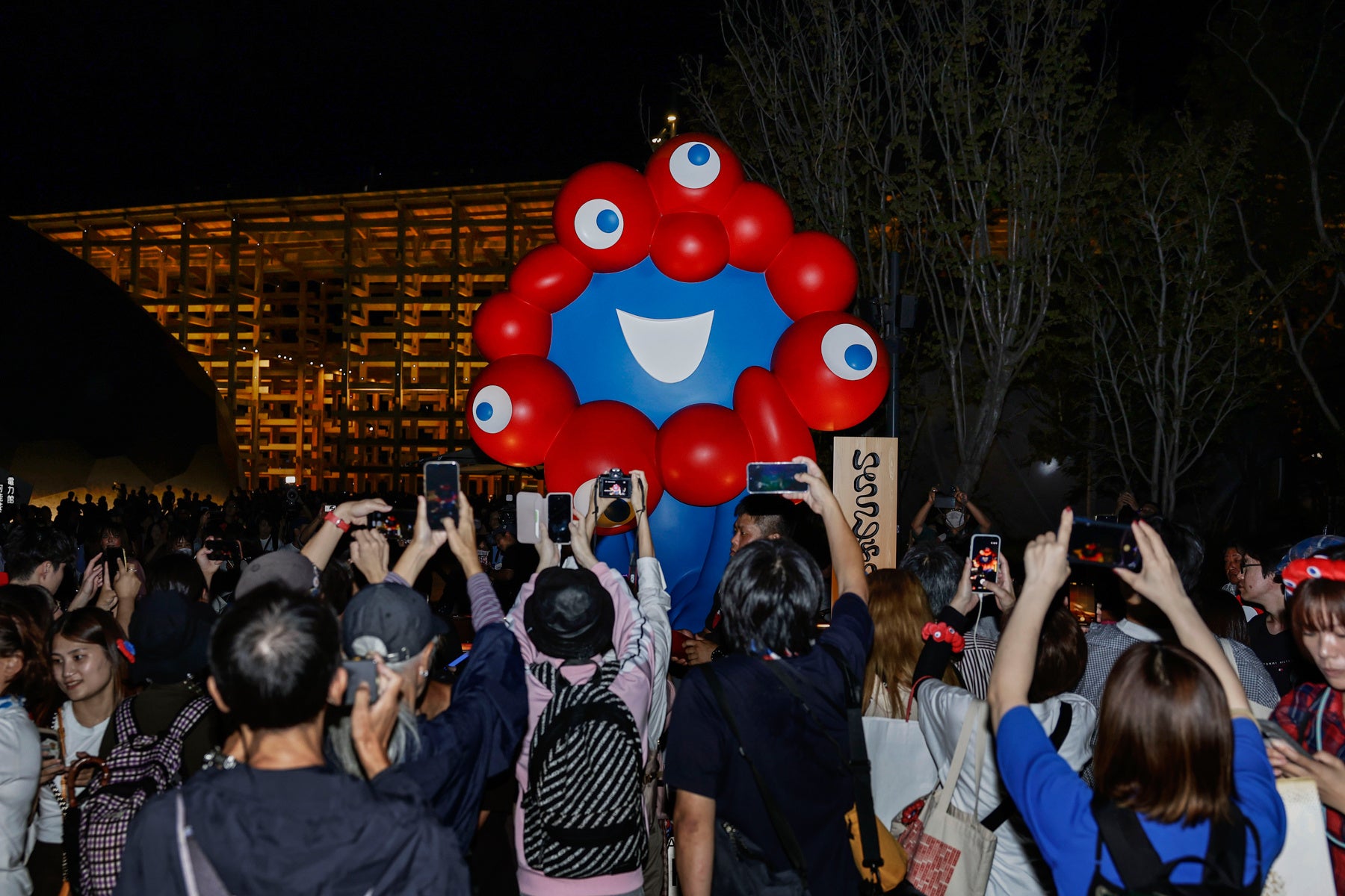 万博が開幕し、来場者を迎える公式キャラクター「ミャクミャク」(2025年4月13日)
