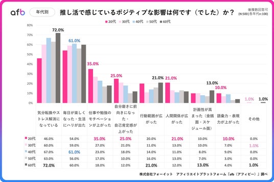 アフィリエイトプラットフォーム「afb(アフィビー)」< https://www.afi-b.com/ >の開発運用をおこなう株式会社フォーイットは、全国の20代~60代までの男女500人を対象に推し活に関するアンケートを実施し、年代別等の特徴についてまとめました。