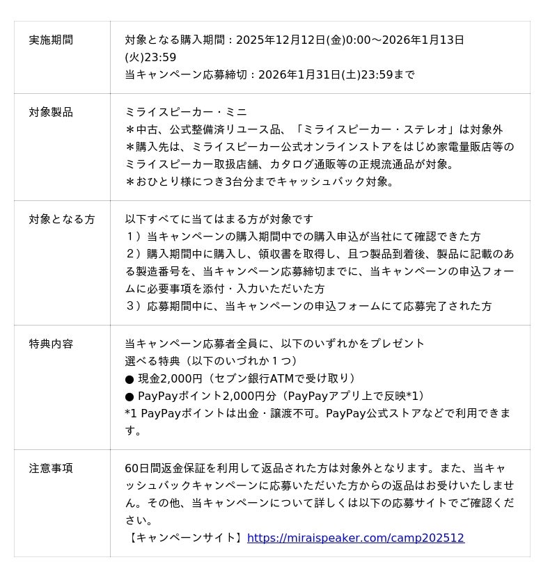 「100年の人生をテクノロジーで豊かにする」という想いのもと、テクノロジーの力で、誰もが明るく前向きに暮らせる社会づくりをめざす株式会社ミライスピーカーは(所在地:東京都中央区、代表取締役社長:山地浩、以下:「当社」)は、2025年12月12日(金)~2026年1月13日(火)の期間中、「ミライスピーカー・ミニ」をご購入いただいたお客様を対象に、応募者全員に2,000円分の現金またはPayPayポイントをプレゼントする「キャッシュバックキャンペーン」を実施いたします。