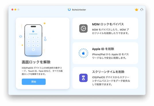 BuhoUnlockerはiPhone/iPad向け、あらゆるもののロックを安全に解除できるソフトです。このソフトであれば、iPhoneの画面ロックを解除したり、スクリーンタイムパスコードを削除したり、MDMをバイパスしたり、Apple IDを削除したりすることができます。iPhoneのパスコードを忘れたら、在宅で自分で処理できます。BuhoUnlocker 公式サイト:https://www.drbuho.com/jp/buhounlocker