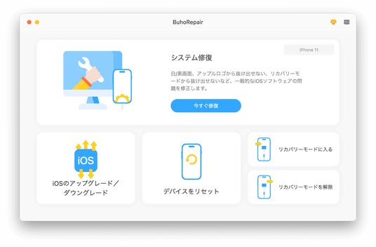 BuhoRepairはiPhone/iPad向けのシステム修復ツールです。例えば、お使いのiPhoneをiOS 26にアップデートした後、不具合が出たら、BuhoRepairで修復できます。これ以外にも、iPhone・iPadがフリーズしたり、Appleロゴの画面で止まったりなど一般的なiOSシステムの問題はBuhoRepairで修正できます。それに、BuhoRepairにはiOSアップグレード/ダウングレード、デバイスのリセット、およびリカバリーモードに入る/解除などの機能も搭載しております。