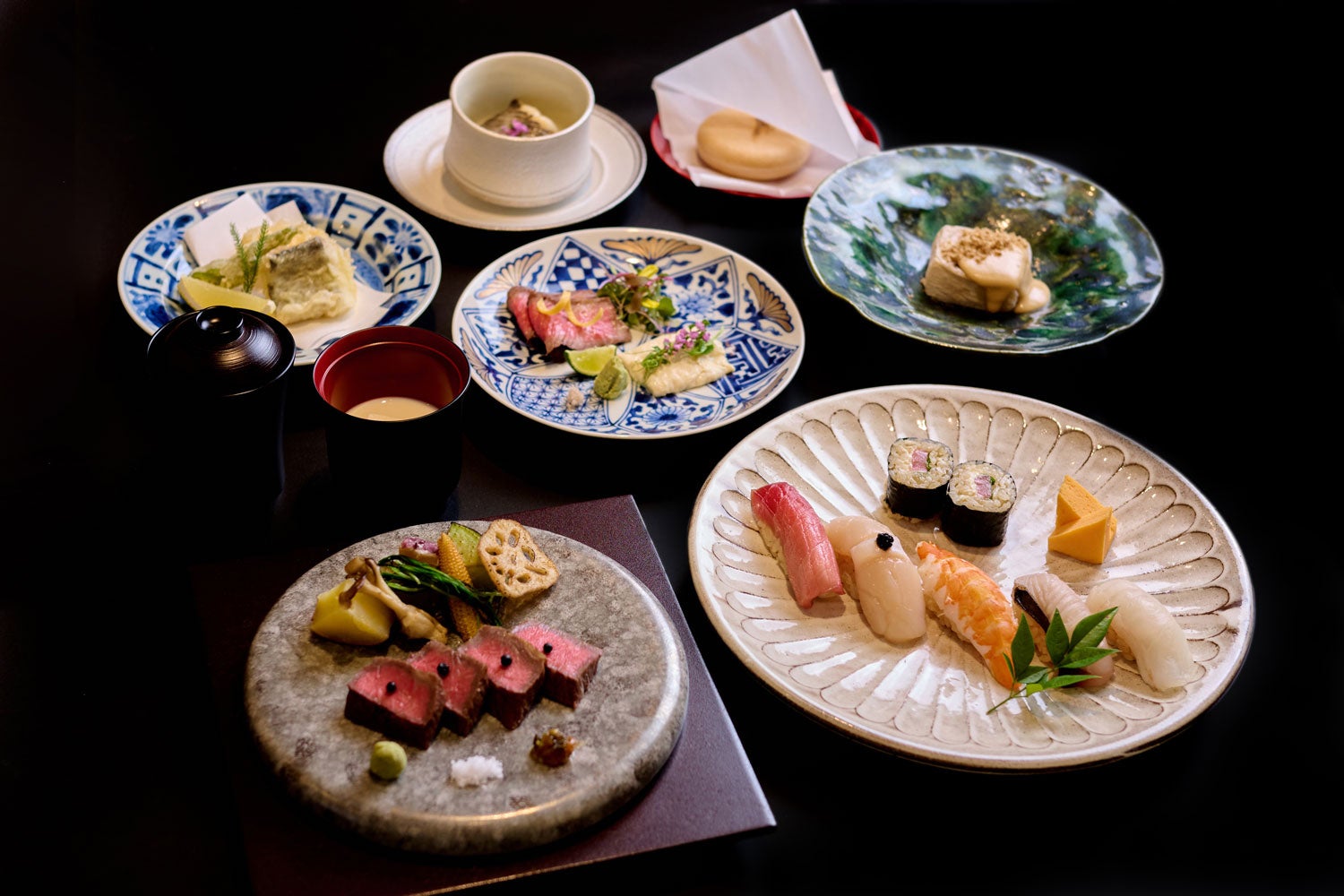 季節の移ろいを感じる2つの会席コースやすまるでは、旬の食材を贅沢に使った2種の会席コースをご用意しております。創業から人気の自家製豆富をはじめ、黒毛和牛や江戸前鮨など、和の滋味を余すことなく愉しめる構成となっております。
