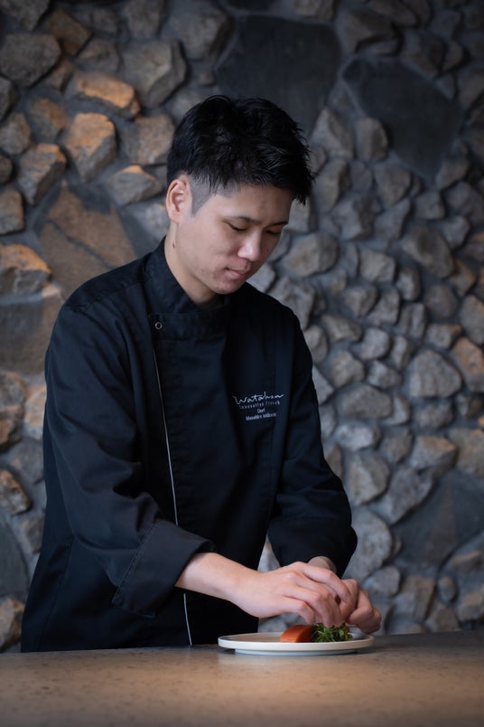 福岡県出身。2013年に「ヒルトン福岡シーホーク」へ入社し、和食・鮨・鉄板焼きなど幅広いジャンルで経験を積み、鮨割烹「ともづな」では握りや包丁さばきなど鮨の基礎を学ぶ。2022年より鮨・日本料理「暦」にて副料理長として腕を振るい、2024年に料理長へ就任。食材の“最もおいしい瞬間”を見極め、素材の声に寄り添う姿勢を大切にしている。和食・鮨・鉄板焼きで培った確かな技術と、素材に寄り添う感性を礎に、素材の持ち味を活かしつつ既成概念にとらわれない一皿を追求している。「お客様が自然と笑顔になる料理」を信条に、その日の特別な時間を丁寧に彩り続けている。