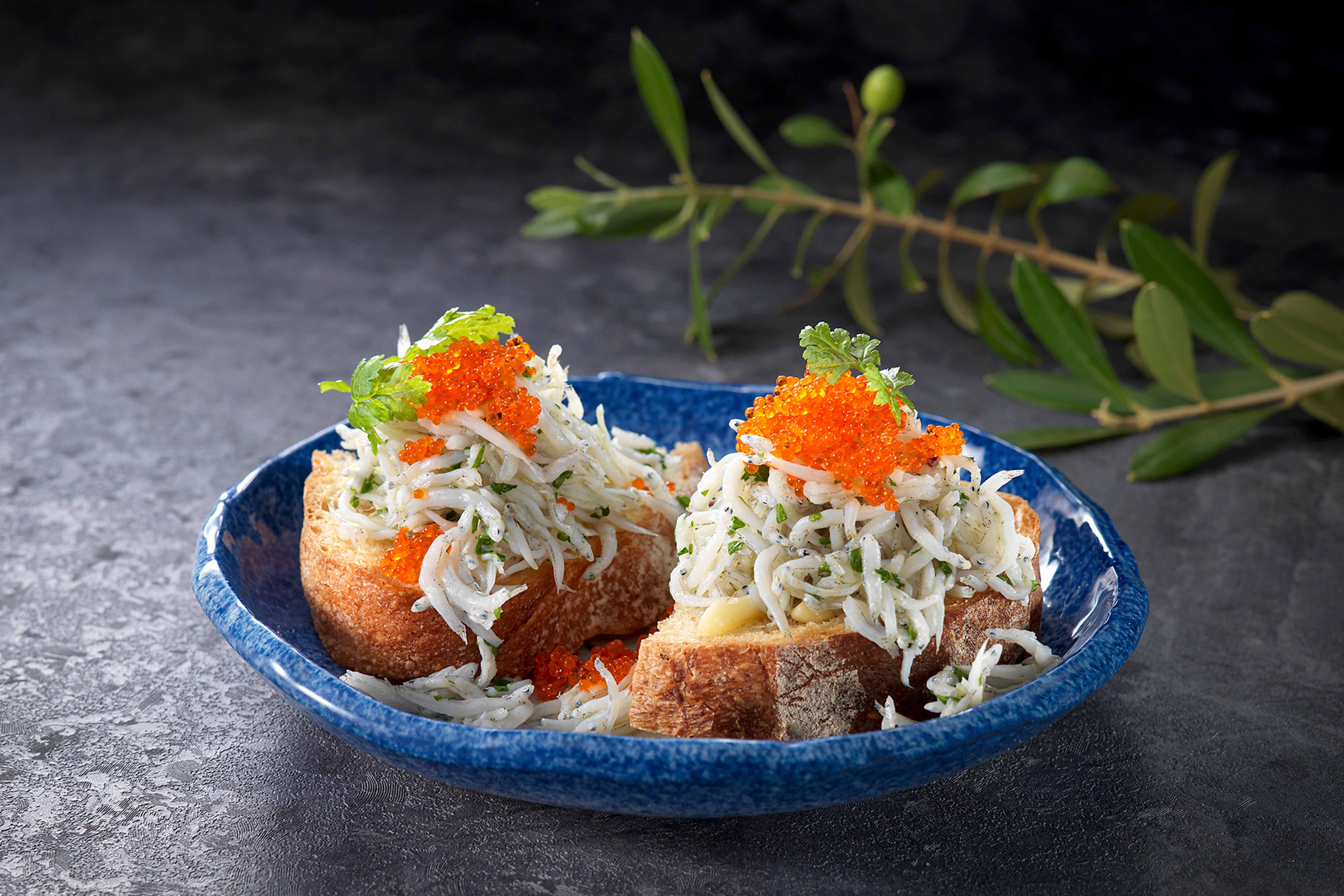 岸和田漁港の釜揚げしらすのこぼれブルスケッタ噛みしめるほどに旨味が広がるカンパーニュに、こぼれんばかりの釜揚げしらすと、プチプチ食感が楽しいとびっこをトッピング。