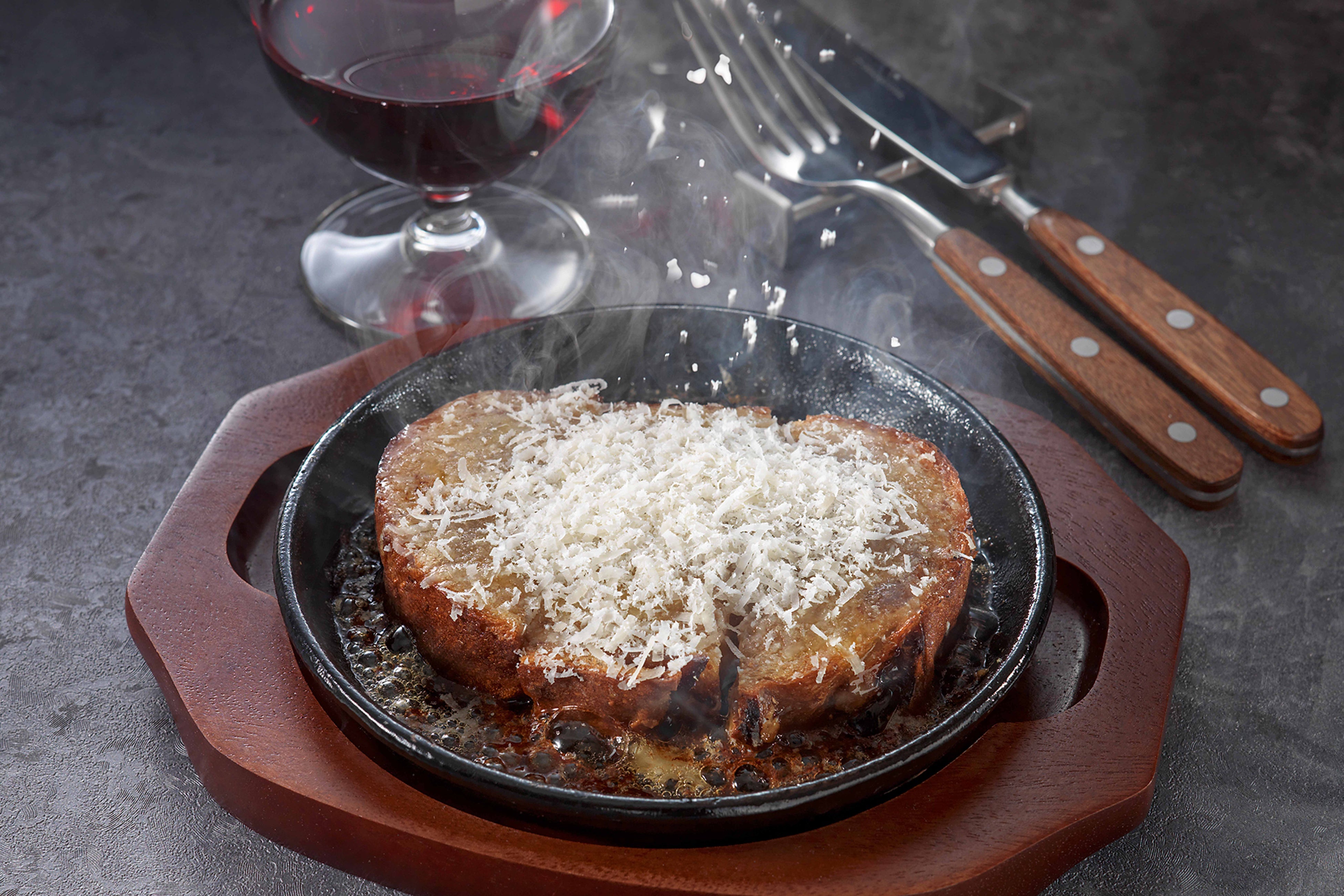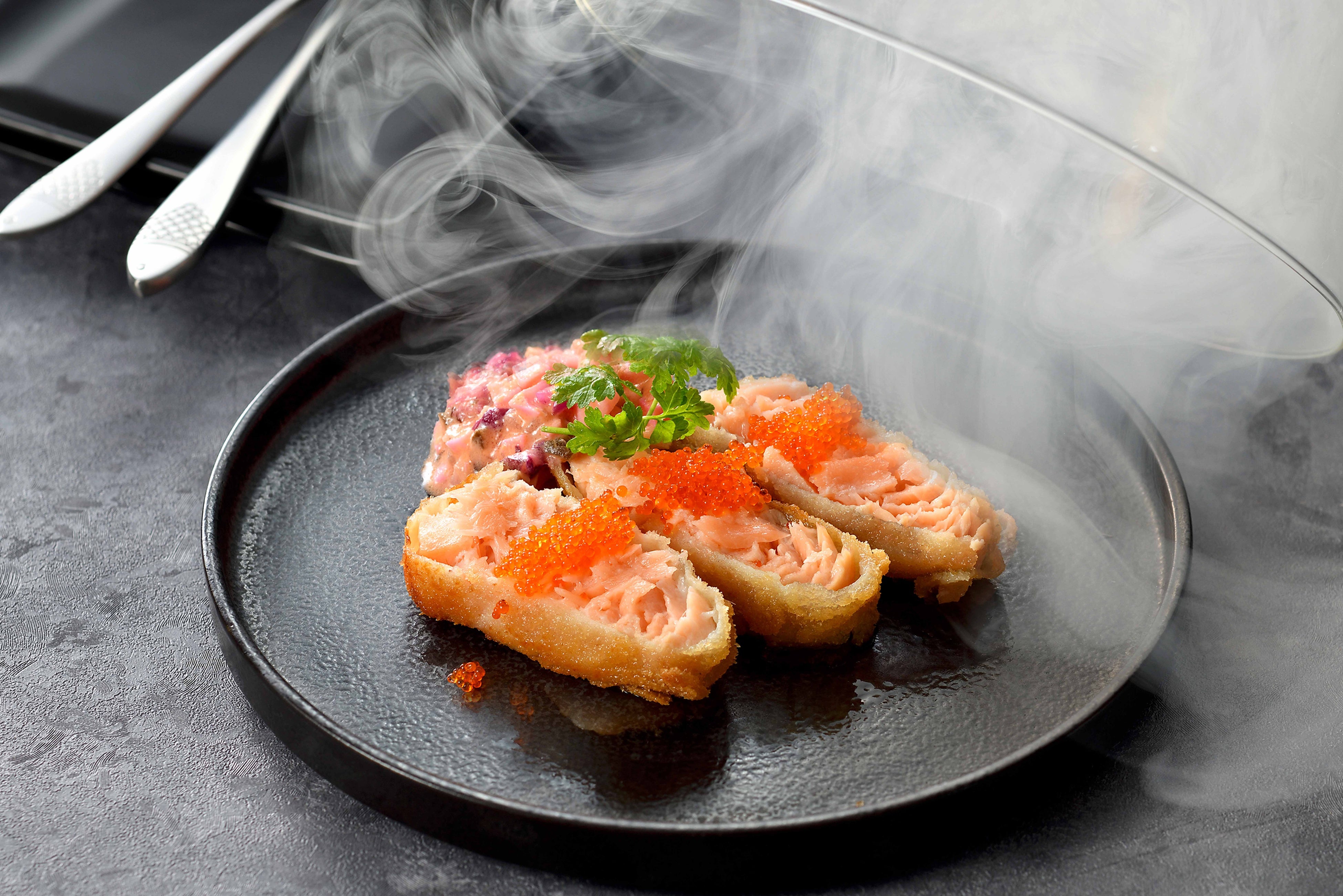 鳥取県産グランサーモンのレアカツ程よい脂とまろやかな味わいが特徴のグランサーモンをレアに仕上げました。ご提供時のスモーク演出は動画映え間違いなし。