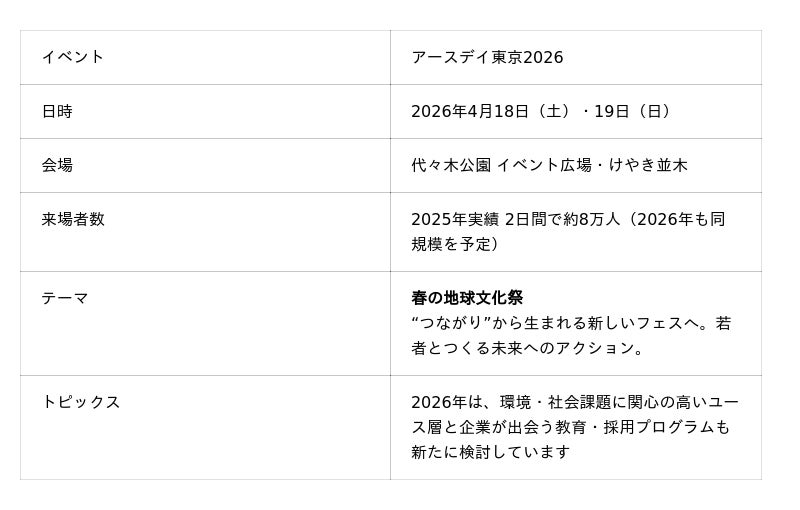 アースデイ東京2026では、単なるイベントではなく、来場者・出展者・企業・学生・地域が混ざり合い、次のアクションが生まれる場づくりを重視しています。