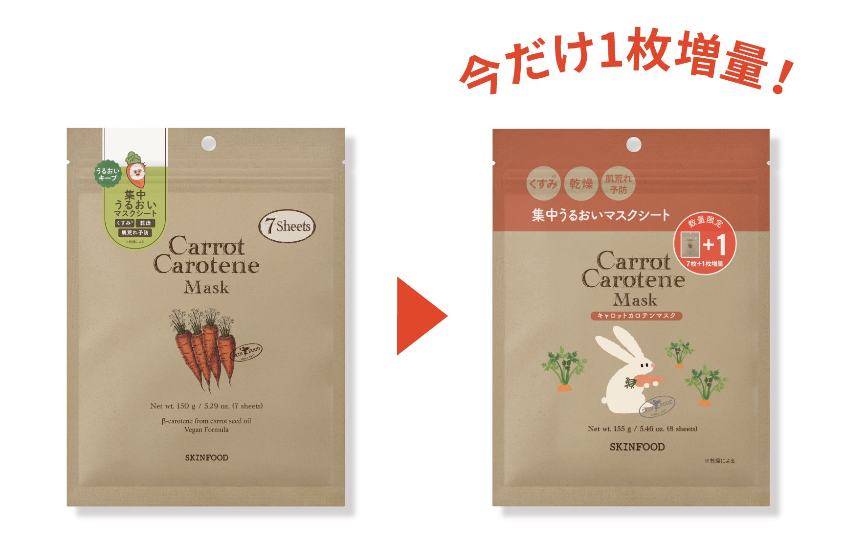 株式会社IKホールディングス(本社:愛知県名古屋市 代表取締役:長野庄吾)の100%子会社、株式会社フードコスメ(所在地:東京都中央区 代表取締役:飯田悠起)は、素肌が喜ぶ食べ物から生まれたトータルコスメブランド『SKINFOOD』(スキンフード)より、キャロットカロテンマスク7枚入を数量限定で1枚増量し「キャロットカロテンマスク(8枚入り)」として販売いたします。