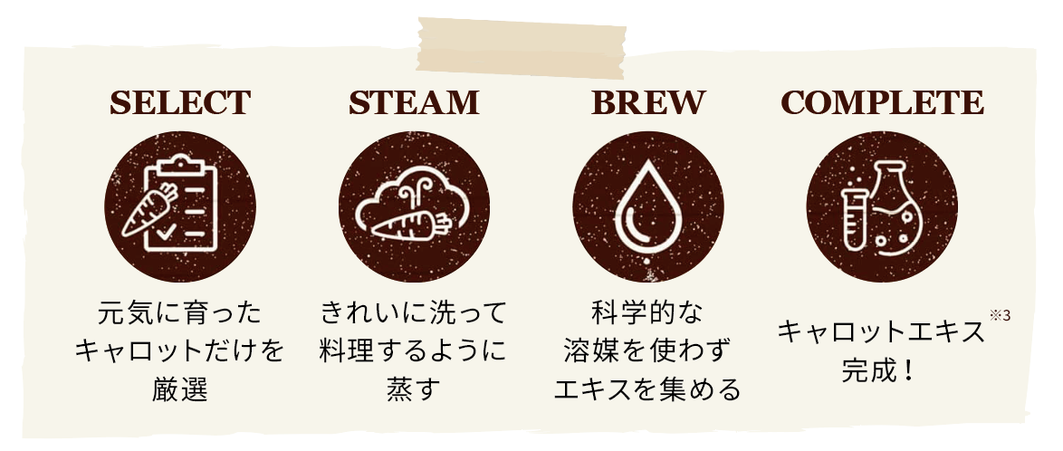 韓国・済州で健やかに育ち、有機農産物認定を受けた無農薬キャロットを使用し、料理するように丁寧に抽出したキャロットエキス(※3)を使用しています。