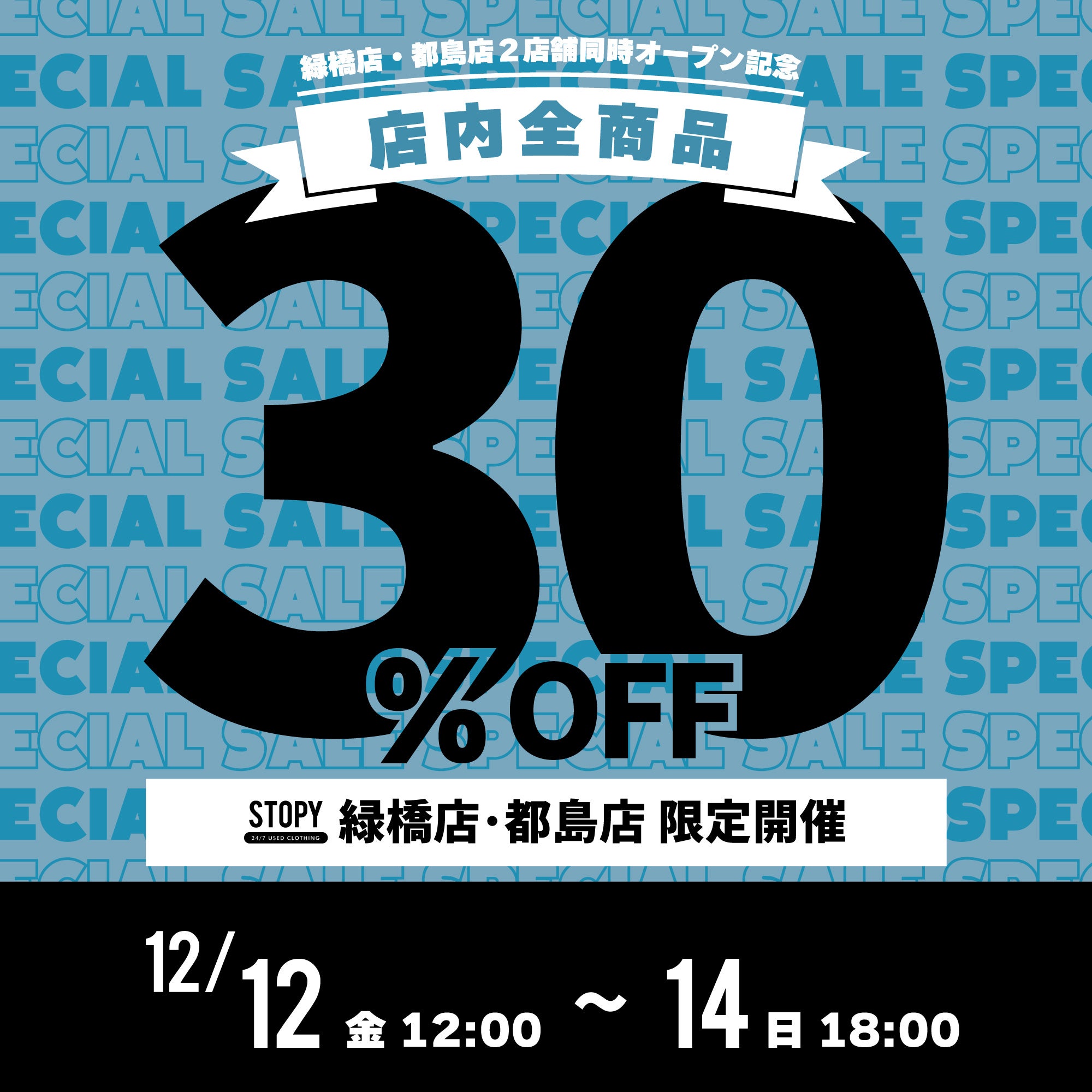 オープン記念として12月12日(金)12:00~12月14日(日)18:00の期間限定で、店内全商品30%OFFのお買得イベントを開催します。