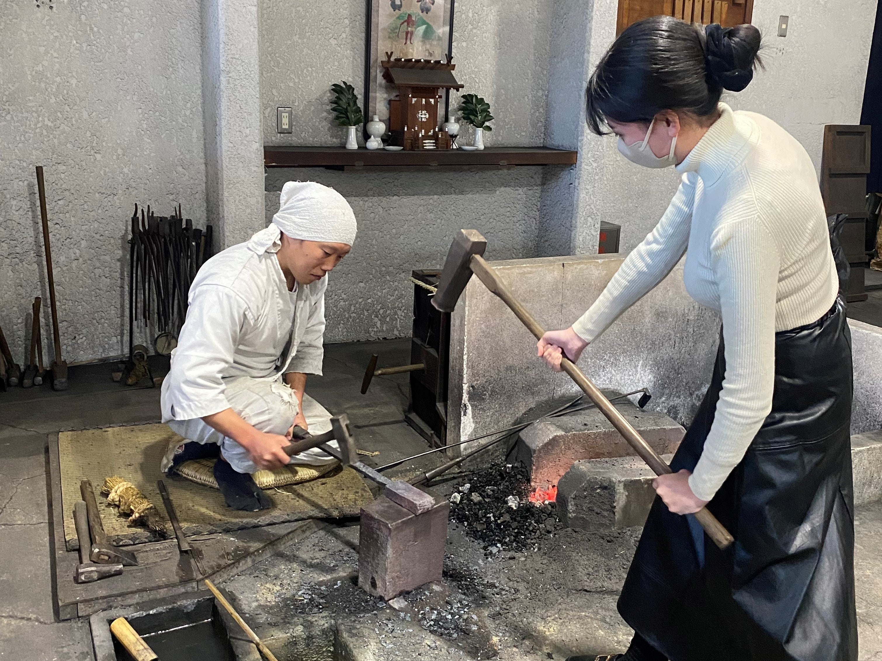 1)関鍛冶伝承館で古式日本刀鍛錬&相槌体験、企画展を見学