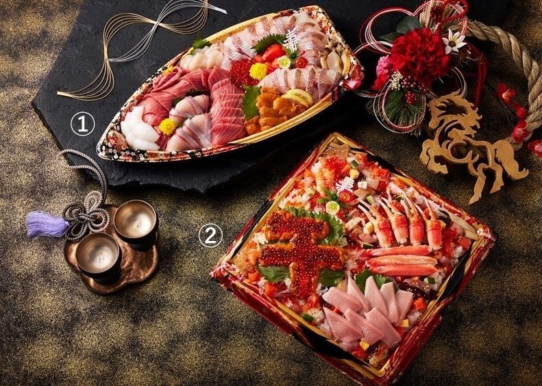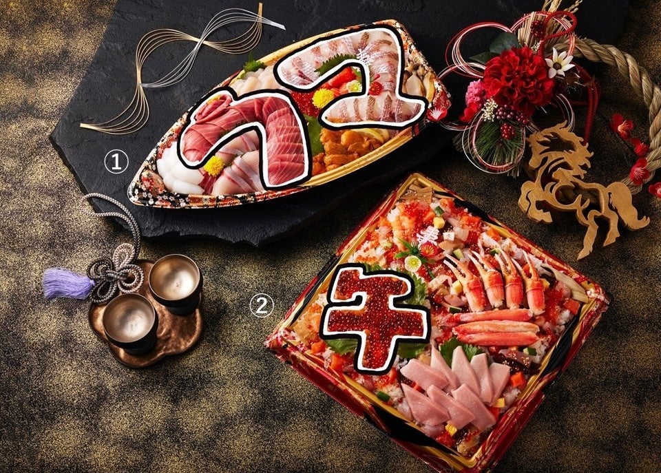 1. 新春 馬文字舟造り“ウマ”(4~5人前)17,280円 <販売予定数1>2. 新春 馬文字豪華海鮮チラシ“午”(4~5人前)15,981円 <販売予定数1>