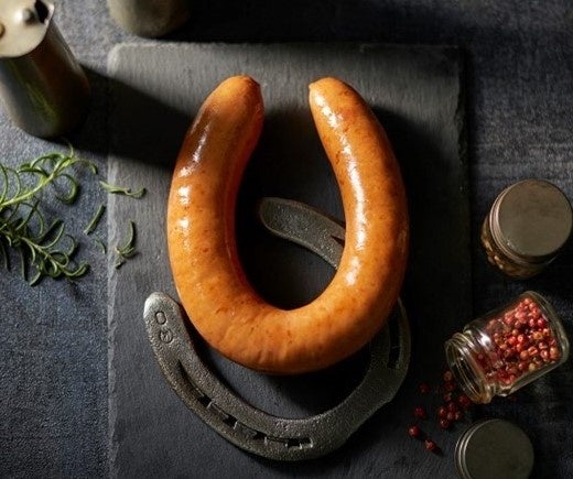 「みやこハム」馬蹄型ポークソーセージ(300g)972円<販売予定数各40> 馬の蹄鉄をモチーフにしたインパクト大のソーセージです。【1階『うまいもんみっけ』】