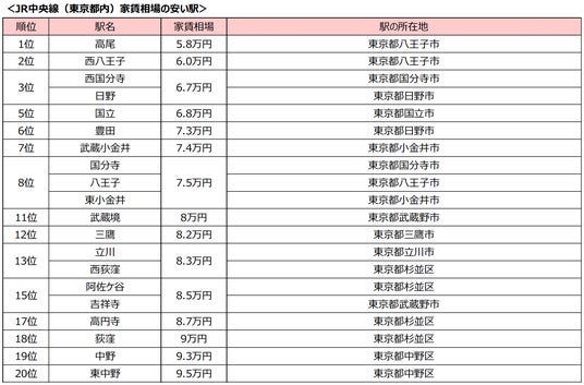 株式会社リクルート(本社:東京都千代田区、代表取締役社長:牛田 圭一、以下リクルート)が運営するニュースサイト『SUUMOジャーナル(スーモジャーナル)』は、住まいや暮らしに関するさまざまなテーマについて調査を実施し、結果をご紹介しています。今回は東京駅から高尾駅まで、東京の東西を結ぶJR中央線の東京都内全32駅それぞれのシングル向け賃貸物件(専有面積10平米以上~40平米未満、ワンルーム・1K・1DK)の家賃相場を調査しました。レターでは上位20位を紹介します。1位は最西端にある高尾駅でした。こちらの調査の詳細は『SUUMOジャーナル』 内でお知らせしています。