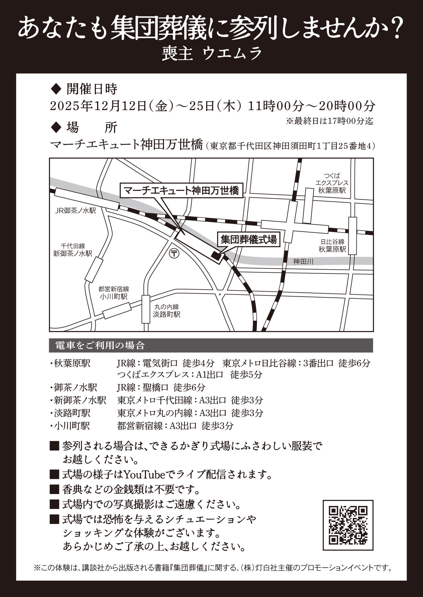 株式会社灯白社(本社:東京都渋谷区、代表取締役:小木曽一輝)は、ホラーモキュメンタリー作家・くるむあくむ氏の書き下ろし長編小説『集団葬儀』(講談社、12月11日(木)発売)に合わせ、作品世界を追体験できるプロモーションイベント「集団葬儀」を2025年12月12日(金)よりマーチエキュート神田万世橋にて開催いたします。
