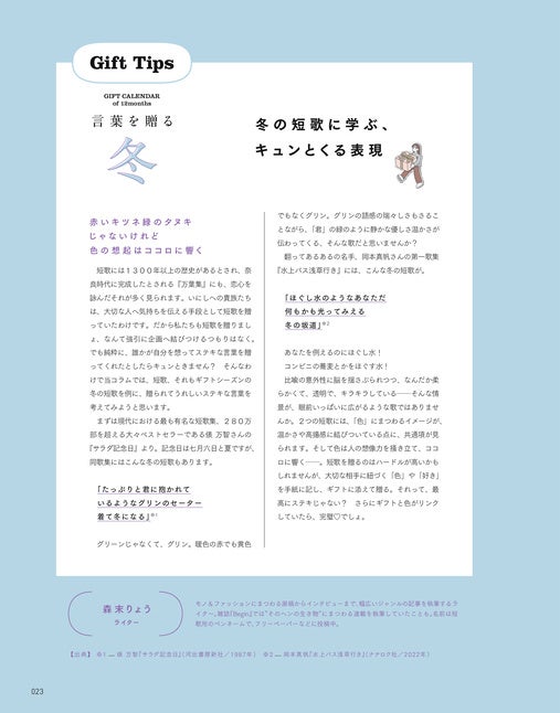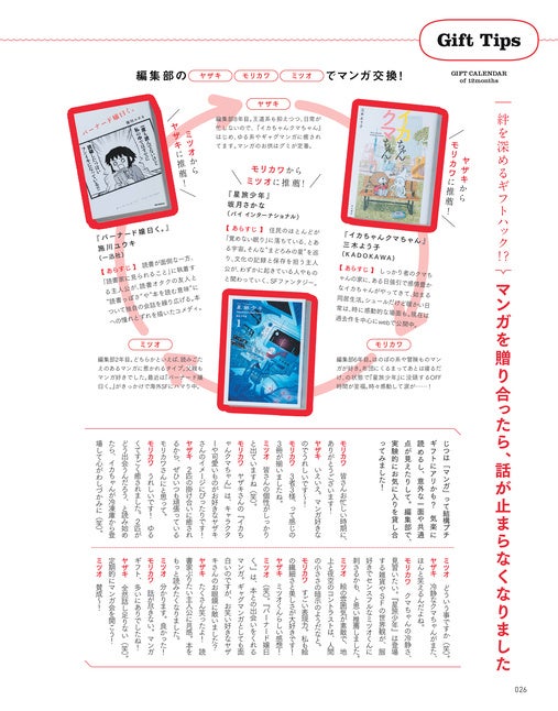 月ごとのギフト提案のほかに、コラムページも充実。ラッピング指南や漫画を贈り合ってみる提案、言葉を贈るストーリーの紹介、巻末には価格帯からギフトを逆引きできる”ギフトプライス早見表”まで、知っておくと役に立つ&贈ることがいっそう楽しくなる誌面コラムにもぜひご注目ください。
