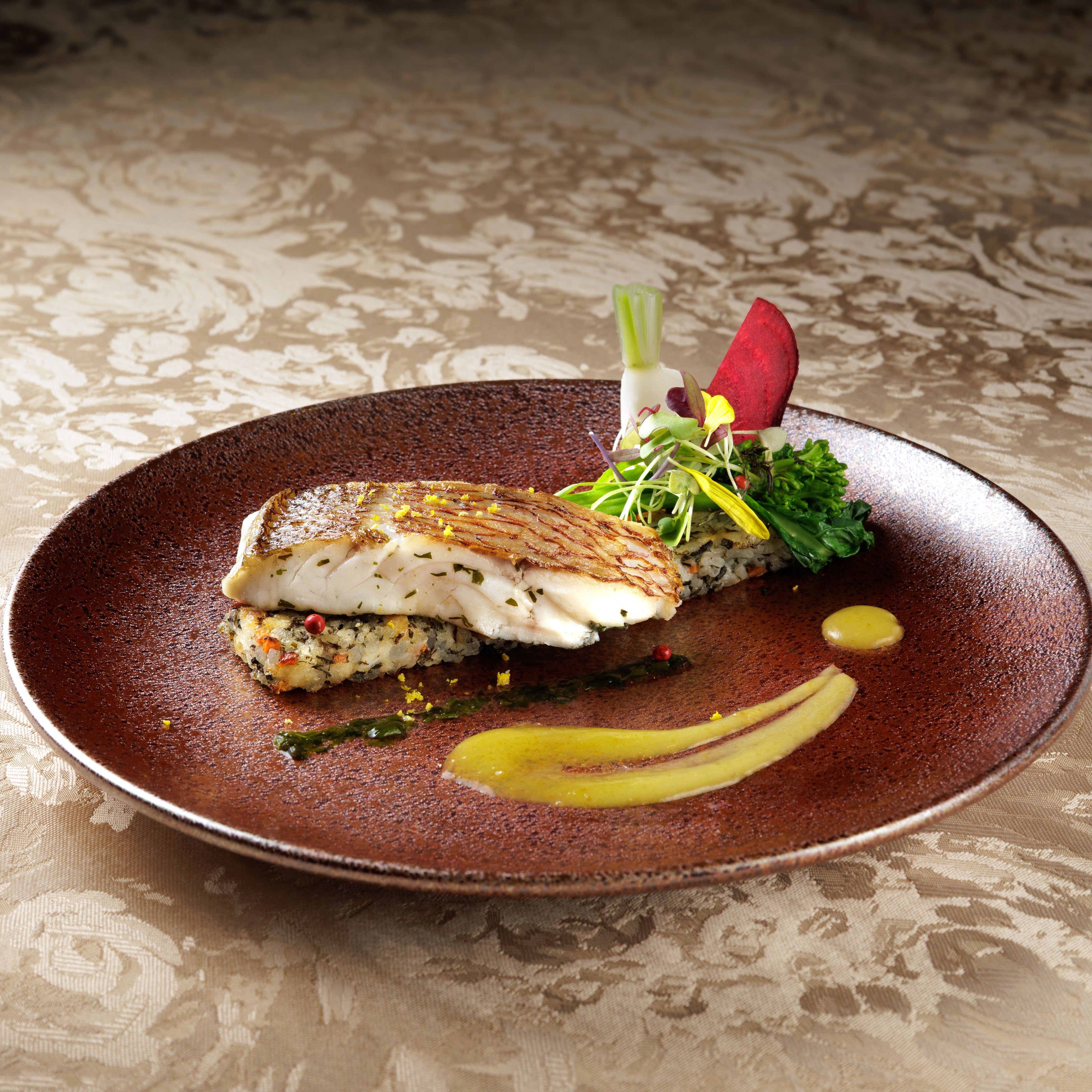 「伊勢まだい」と「アカモク」のハーモニー ゆず香るバターソース 焼きリゾット添え
