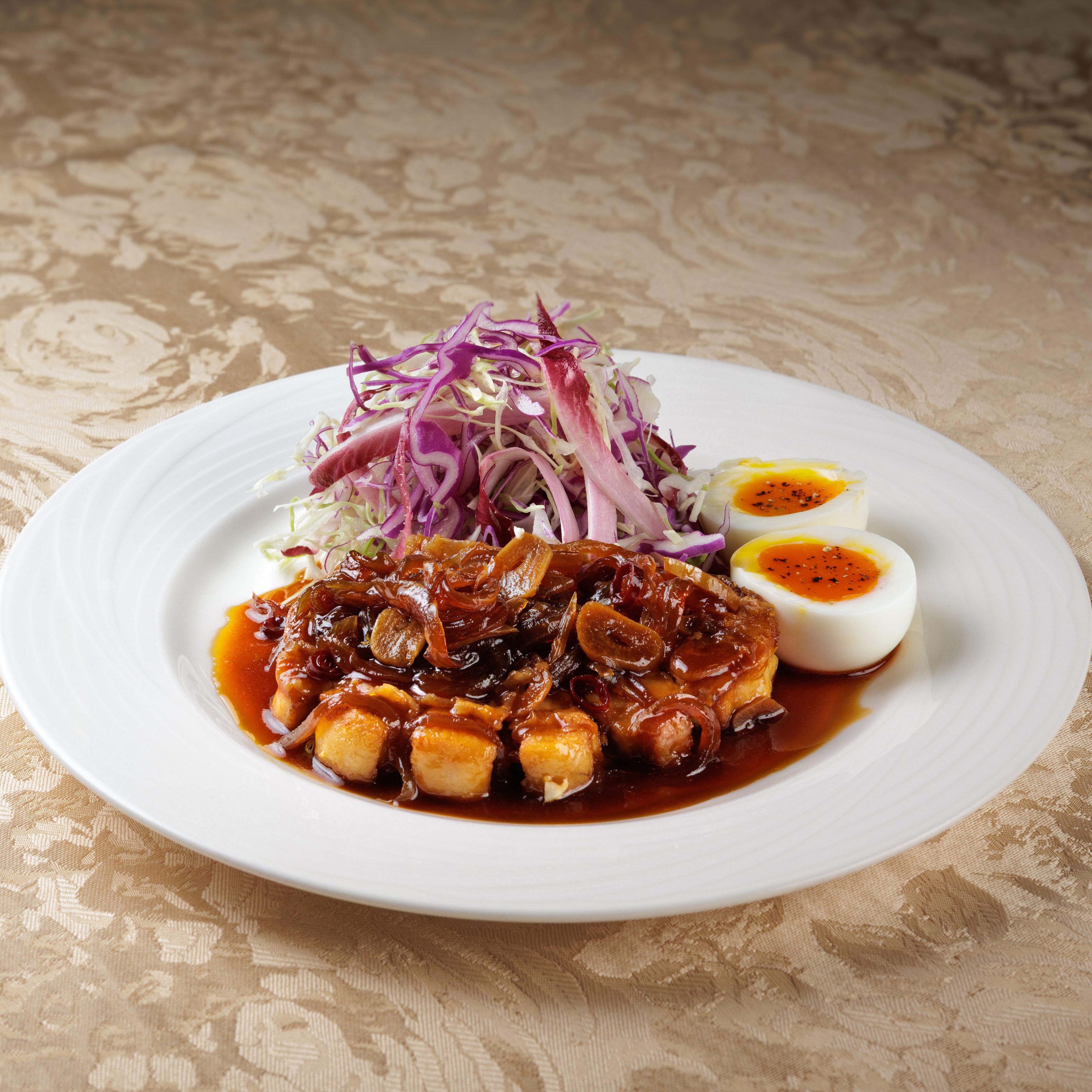 三重県四日市市のソウルフードとして親しまれる「トンテキ」。その文化にちなみ、三重県熊野市だけで生産される香酸柑橘の一種である「新姫」の果汁で「伊勢うまし豚」をマリネしました。スダチやシークワーサーのような酸味が強く、爽やかな香りをもつ「新姫」が、豚肉の旨味をいっそう引き立てます。ぜひご堪能ください。