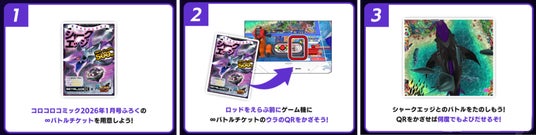 12月12日(金)発売の月刊コロコロコミック2026年1月号付録の、「∞バトルチケット」をゲームセンターの『釣りスピリッツ ワンダー』にかざすことで『シャークエッジ』とバトルすることができます。チケットは、2025年12月12日(金)~2026年2月15日(日)までの期間限定で使用でき、コロコロコミックの付録には『釣りスピリッツ ワンダー』の設置店で『釣りスピQRカード BEYBLADE Xコラボver.』と交換できる『引換券』も付属します。