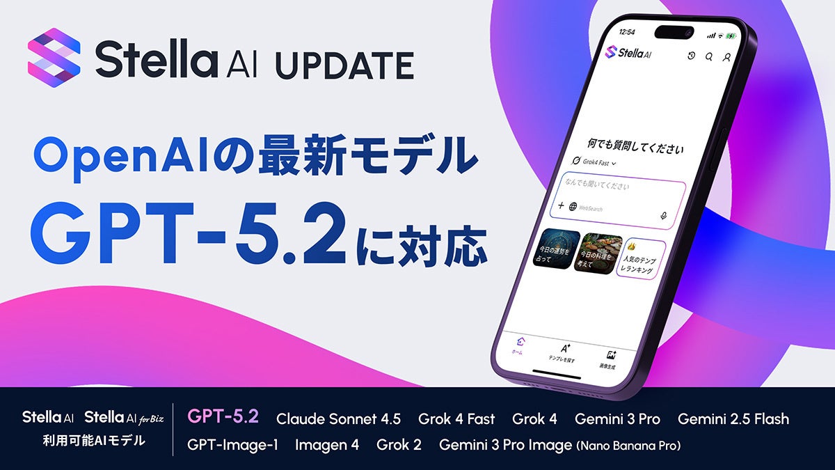 生成AIサービス開発を手掛ける株式会社SUPERNOVA(本社:東京都港区 代表取締役社長 木本 東賢 以下、当社)は、当社の生成AIサービス「Stella AI」および「Stella AI for Biz」において、OpenAI社の最新AIモデル「GPT-5.2」を2025年12月12日(金)より提供開始します。