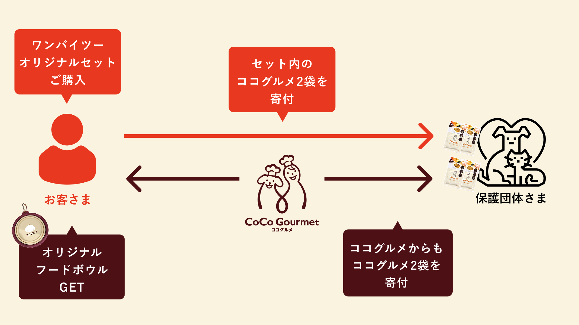 例:チャリティーフードボウルとココグルメ・レトルト2袋セットを購入→当社が2袋を上乗せ→合計4袋のごはんが保護犬へ寄付