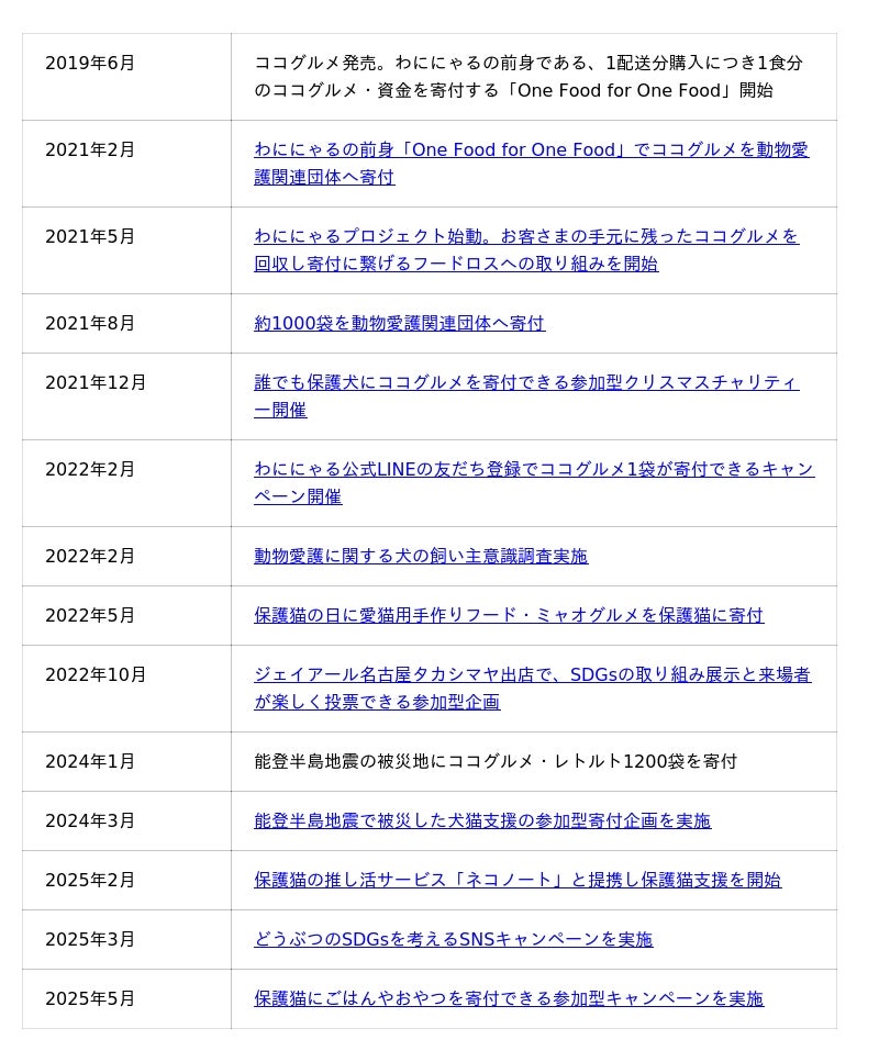 これまで当社では、商品を購入いただいた際の利益の一部を保護犬猫へ寄付する活動や、「病気やアレルギーで食べられなくなった」「愛犬が亡くなった」など様々な理由でお客さまの手元に残っている当社商品を回収し、保護団体さまへお届けする活動などを継続してまいりました。当社単独で取り組むのではなく、保護動物を支援したいと考える方々と手を取り合い動物福祉活動を行うことで、おかげさまでこれまで寄付したココグルメ、ミャオグルメは約70,000袋にのぼります。(2021年2月22日~2025年5月20日)