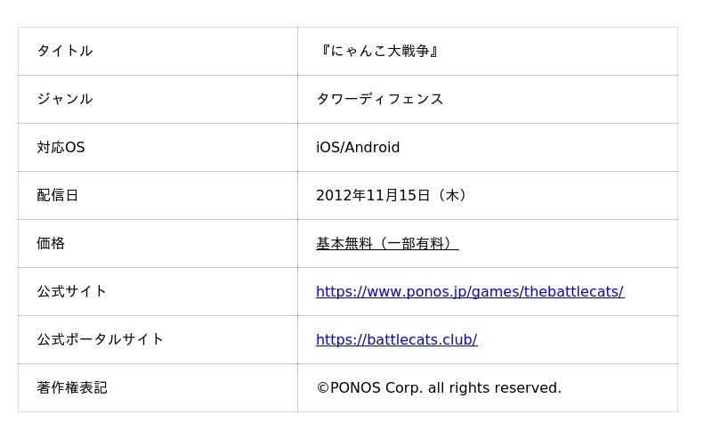 『にゃんこ大戦争』は、iOS・Android向けタワーディフェンスゲームです。プレイヤーは様々な能力を持つ「にゃんこ」たちを編成して、各地を侵略していきます。2012年のリリース以来、個性的なキャラクターや独特の世界観が、日本のみならず世界中の多くのお客様にご支持をいただいています。今後も多様なメディア展開やコラボレーションを積極的に行ってまいります。