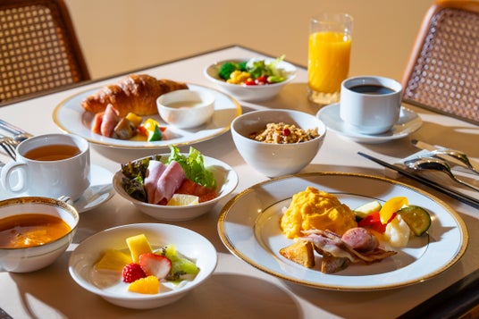 シェフが目の前で仕上げる卵料理や、熊本各地から届く旬の食材が並ぶ和洋中ブッフェ。開放的な空間で、旅の朝を豊かにする特別なひとときをお過ごしください。