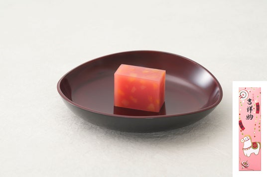 手亡豆と備中白小豆を使用したあっさりとした紅羊羹に、熊本県産のきざみ栗をこめた一品。紅羊羹は曙の空を表し、散らした栗は天駆ける馬の群れに見立てています。おめでたい干支のパッケージに包んで提供します。