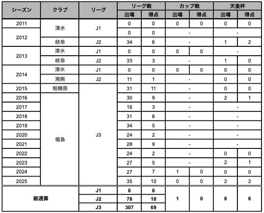【サッカー歴】宝塚ジュニア FC→学文中→滝川⼆高→清水エスパルス→FC 岐⾩→清水エスパルス→FC 岐⾩→清水エスパルス→湘南ベルマーレ→清水エスパルス→SC 相模原→清水エスパルス→福島ユナイテッド FC