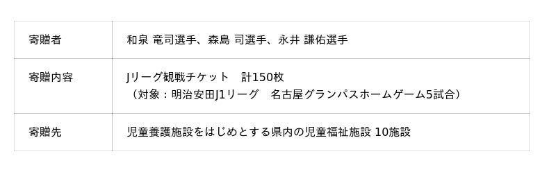 なお、名古屋グランパスの選手からは、2010年度より県内の児童福祉施設などに対してチケットの寄贈を行っており、今年度で12回目となります。