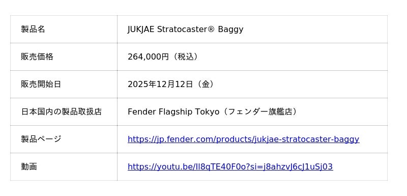 『JUKJAE Stratocaster(R) Baggy』は、2025年12月12日(金)よりFender Music Korea正規取扱店、そして日本ではFender Flagship Tokyoにて数量限定で販売を開始します。