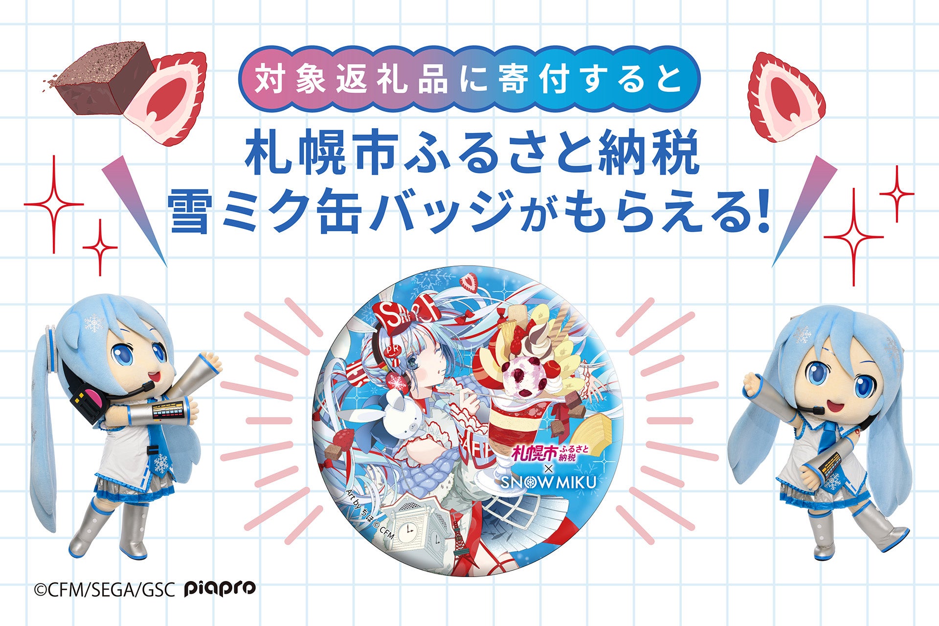 本企画では、札幌スイーツの対象返礼品に“描き下ろし雪ミク缶バッジ”を添えてお届けします。