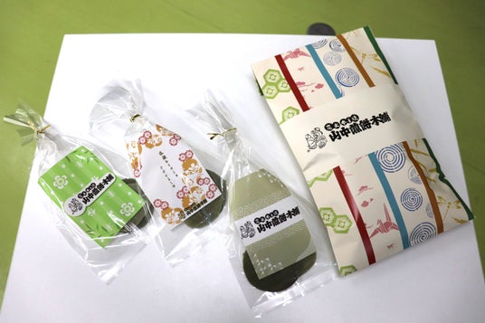 本企画では、明治33年創業の老舗煎餅店「山中煎餅本舗」(喜多方市)の煎餅手焼き体験ワークショップ用のシールや商品購入時の包装紙のデザインを在校生が考案しました。