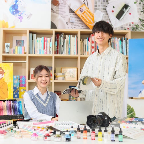 デザインの基礎を幅広く学び、企業連携でのデザイン制作などの実践授業を通じて、デザイナー・webデザイナーのプロを目指す学科です。