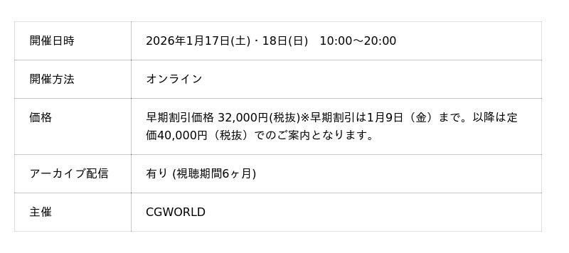 株式会社ボーンデジタル(本社:東京都千代田区、CEO:新 和也、URL:https://www.borndigital.co.jp/)は、2026年1月17日(土)・18日(日)の2日間にわたり、映画・ゲームなどの制作現場で活用されているプロシージャルCGツール「Houdini」に特化したスキルアップイベント「Houdini