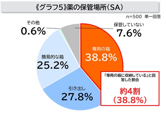 - 常備薬の保管場所については、約4割(38.8%)が「薬を収納するための専用の箱」で管理している一方、「引き出し」(27.8%)や「空き箱などの簡易的な箱」(25.2%)で保管していると回答