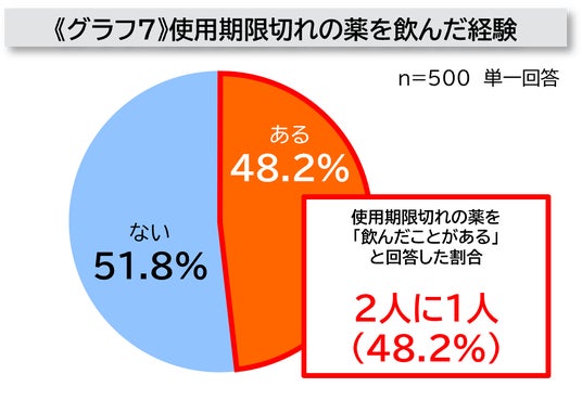 - 一方で、全体の約5割(48.2%)が「使用期限切れの薬を飲んだことがある」と回答した