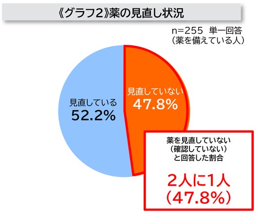 - 一方で、薬を備えていると回答した人のうち、2人に1人(47.8%)が「常備薬を見直していない(確認していない)」ことが判明