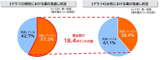 また、「常備薬の見直し状況」を男女別に比較したところ、男性の約6割(57.3%)、女性の約4割(38.9%)が「見直していない(確認していない)」と回答しました《グラフ3》《グラフ4》。男女間で18.4ポイントの差が見られ、薬の確認や管理においては、男性の方が見落としやすい傾向があることが分かりました。