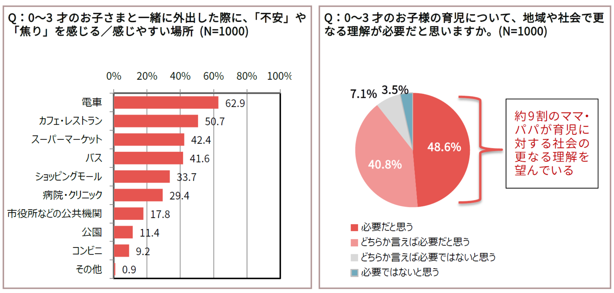 具体的には、公共の場所のうち「電車」(62.9%)、「カフェ・レストラン」(50.7%)、「スーパーマーケット」(42.4%)で不安を感じやすく、困りごととしては「子どもが泣き止まない」(54.4%)、「荷物の多さ」(40.5%)、「ベビーカーの利用が難しい」(32.5%)などが挙げられています。