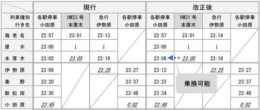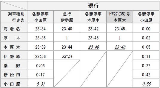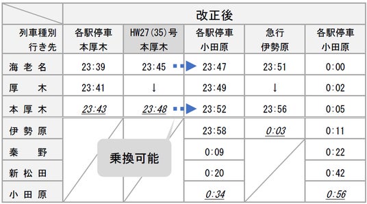 小田原着の最速時刻 現行0:02 → 改正後23:48(△14分)